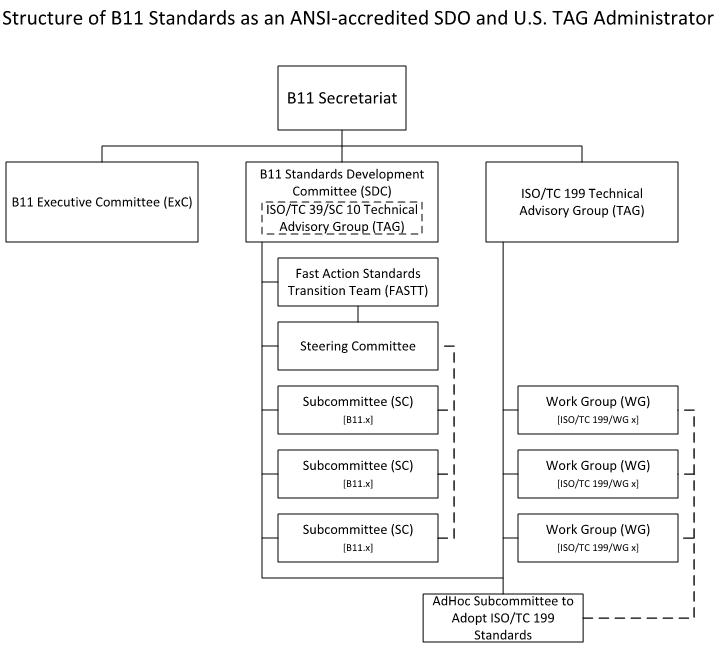B11 Standards, Inc. is also accredited by ANSI as the United States Technical Advisory Group (TAG) Administrator to two International Standards Organization (ISO) Technical Committees (TC), ISO/TC 199 on Machinery Safety and ISO/TC 39 /SC 10 on Machine Tool Safety.